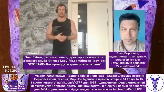 14.00 15.04.2020 - Vk.com/WinWinNews - Прямой эфир на VK.com/VKTPP - Олег Габов, фитнес-тренер, директор и основатель женского клуба Фитнес Lady -Vk.com/fitness_lady_ber - "ИЗОЛАЙВ- Как проводить тренировки онлайн" Скачать mp3-аудиоподкаст https://yadi.sk/d/oFFoVv9k4fRP7Q https://vk.com/winwinnews?w=wall-192239890_103