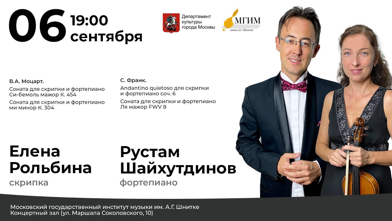 В программе камерного ансамблевого вечера сочинения для скрипки и фортепиано В.А. Моцарта и С. Франка. Исполнители - профессора института: Елена Рольбина и Рустам Шайхутдинов