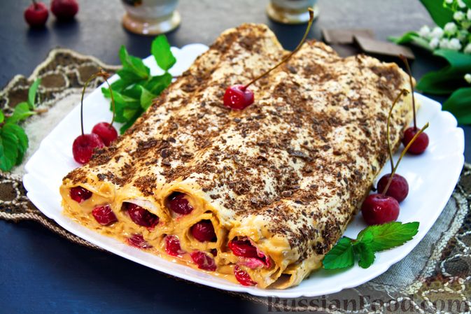 Торт "Монастырская изба" по этому рецепту готовится без выпечки, из тонкого лаваша вместо традиционного песочного теста. Крем простейший – из сметаны и варёной сгущёнки. Листы лаваша хорошо пропитываются, торт с вишней получается нежным, сочным, бесподобно вкусным, с нотками карамели. #НаПраздничныйСтол #ТортИзЛаваша #ТортСВишнями #ЛетнийПирог
