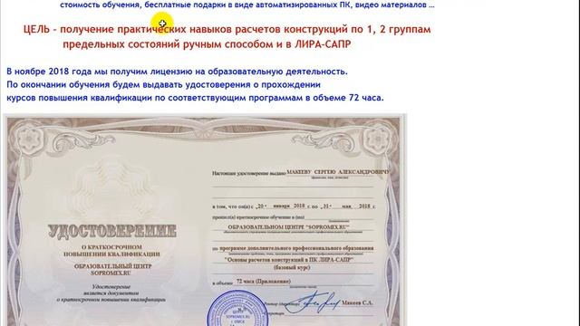 Приглашаем студентов, проектировщиков на обучение по 4 программам http://makeev.justclick.ru/4kursa_oc18?utm_source=youtube&utm_medium=social&utm_campaign=4kursa_oc18&utm_term=sdjYhpnu26w : - "Основы расчетов конструкций на прочность и жесткость (термех, сопромат для ПГС)" - 18 занятий по 2 часа; - "Основы расчетов конструкций в ПК ЛИРА-САПР" - 18 занятий по 2 часа; - "Основы расчетов ЖБК. Теория и практика ручного счет. Расчеты ЖБК в ПК ЛИРА-САПР" - 18 занятий по 2 часа; - ИНТЕНСИВ "Теория и практика расчетов НДС элементов стальных узлов в ЛИРА-САПР с учетом совместной работы конструкций и физической нелинейности стали" - 4-х дневный интенсив по 2 часа в день.