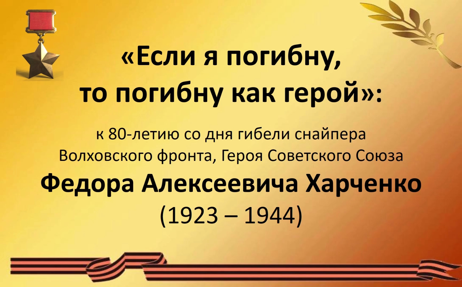 Отдел краеведения предлагает вашему вниманию виртуальную выставку, посвящённую Федору Алексеевичу Харченко. Выставка приурочена к 80-летию со дня гибели Героя Советского Союза Федора Алексеевича Харченко (1923 – 1944). На выставке представлены научно-популярные издания, публикации из местной периодической печати из фондов Новгородской областной универсальной научной библиотеки, рассказывающие о боевом пути одного из лучших снайперов Волховского фронта, погибшего в боях за освобождение Новгородской земли от немецко-фашистских оккупантов. Харченко Федор Алексеевич родился в деревне Малая Белозерка в Днепропетровской области, ныне Васильевского района Запорожской области 20 сентября 1923 года. Старший сержант, комсорг батальона, снайпер 1-го батальона 13-го стрелкового полка 2-й стрелковой дивизии 59-й армии Волховского фронта. Погиб 23 января 1944 года в бою за деревню Осия Новгородского района. 6 мая 1965 года присвоено звание Героя Советского Союза, посмертно. Похоронен в Великом Новгороде у кремлёвской стены. Справки по телефону: 8(8162) 77-37-88 – отдел краеведения