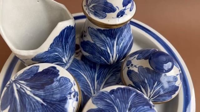Китайский набор для сервировки с бронзовыми ободками - https://gallerique.ru/tproduct/665744141312-kitaiskii-nabor-dlya-servirovki-s-bronzo Блюдо с предметами для сервировки 1950-х годов. В состав набора входят: сосуд с высокой пикой, салфетница, крупная и малая шкатулки с крышкой. Изделие сочетает в себе бронзовые элементы с подглазурной ручной росписью в сине-белой палитре, характерной для китайской традиционной керамики. Все комплектующие декорированы изящными стилизованными под листья узорами. Диаметр поддона: 27 см Высота поддона: 11,5 см Сосуд с высокой пикой: Высота: 17,5 см Диаметр: 8,5 см Салфетница: Высота: 13 см Ширина: 8,5 см Глубина: 6 см Шкатулка с крышкой: Высота: 8 см Диаметр: 8,5 см Маленькая шкатулка: Высота: 8,5 см Диаметр: 7,5 см Состояние: отличное винтажное Материал: керамика, подглазурная ручная роспись, бронза Страна производителя: Китай Период: 1950-е гг.