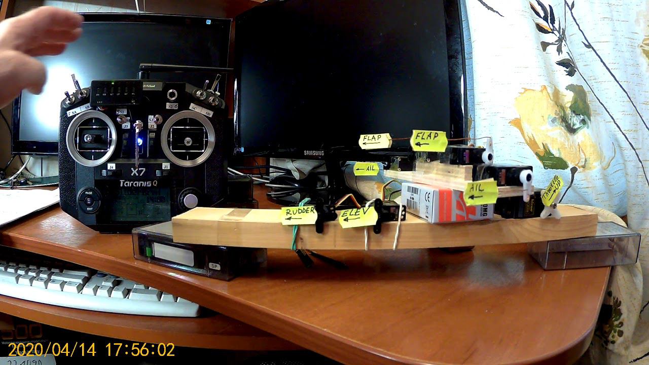 На видео демонстрация результата программирования передатчика Taranis QX7 после установки двух дополнительных переключателей SI и SJ. На плате передатчика маркировка гнёзд двухконтактных разъёмов PAD400 это для переключатель SI и PAD401 для SJ ссылка на видео https://youtu.be/dfvzlon9JOs . Возможность активации переключателей предоставлена в прошивке OpenTX V2.3.5. Программа разработана для управления планером – 5 режимов полёта: FM1 Start – работает электромотор, закрылки взлётная позиция FM2 Cruis – свободный полёт FM3 Soaring (Termal) – закрылки в оптимальном для парения положении FM4 Speed – закрылки приподняты вверх на небольшой угол FM5 Land (with Brake or Brems) – закрылки и элероны работают совместно для торможения. FM0 Manual – для преполётной проверки планера, электромотор заблокирован, закрылки можно проверить потенциометром S2. На позицию потенциометра S1 установлен 6-CH Flight Mode Switcher for APM X-Rock. Для безопасности выполнена блокировка ошибочного включения электродвигателя – он работает только в режиме FM1, блокировка отключается с нижнего положения стика В режиме FM5 стик Throttle управляет воздушным тормозом Brems по-немецки Brake по-английски. Переключатели функции: SI – активирует смеситель Ail to Rud. SJ – активирует смеситель Ail to Flap. SF – Dual rate AIL, ELE, RUD SH - Timer Итог создания программы : мне удалось повторить алгоритм управления планером передатчика JR DSX9 на программном ресурсе Taranis QX7. Я показал демонстрацию на стенде потому что на планере с крыльями 4 метра это трудно демонстрировать в квартире. On the video shows the result of the Taranis zX7 transmitter after two additional SI and SJ switches have been installed. On the board of the transmitter marking the nests of the two-contact connectors PAD400 is for the SI switch and PAD401 for SJ link to the video https://youtu.be/dfvzlon9JOs . The ability to activate the switches is provided in the firmware OpenTX V2.3.5. The program is designed to control the glider - 5 flight modes: FM1 Start - electric motor works, flaps take-off position FM2 Cruis - free flight FM3 Soaring (Termal) - flaps in the optimal position for soaring FM4 Speed - flaps raised up to a small angle FM5 Land (with Brake or Brems) - flaps and elerons work together for braking. FM0 Manual - for pre-flight check of the glider, the electric motor is blocked, flaps can be checked by the S2. The 6-CH Flight Mode Switcher for APM X-Rock is installed in the position of the S1 potentiometer. For safety, the wrong on-the-spot electric motor is blocked - it only works in FM1 mode, the lock is disconnected from the lower position of the stick In FM5 mode, the Throttle stick controls the Brems air brake in German Brake in English. Function switches: SI - activates the Ail to Rud mixer. SJ - activates the Ail to Flap mixer. SF - Dual rate AIL, ELE, RUD SH - Timer The result of the creation of the program : I was able to repeat the algorithm of the j. JR DSX9 glider control on the Taranis software resource. I showed the demonstration on the stand because on a glider with wings of 4 meters it is difficult to demonstrate in the apartment.