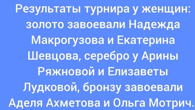Результаты турнира у женщин: золото завоевали Надежда Макрогузова и Екатерина Шевцова, серебро у Арины Ряжновой и Елизаветы Лудковой, бронзу завоевали Аделя Ахметова и Ольга Мотрич.