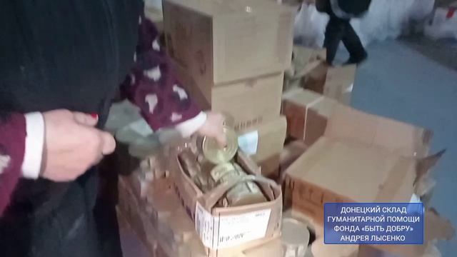 Подготовка продуктовых наборов на донецком складе гуманитарной помощи Андрея Лысенко