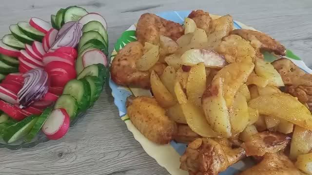 Крылышки Куркума, перец красный (горький), паприка, сушёный чеснок, соль, хмели-сунели - по вкусу Уксус 9%, растительное масло - для маринада (по вкусу). Картофель Соль, специи для картофеля Растительное масло для запекания картофеля (немного).