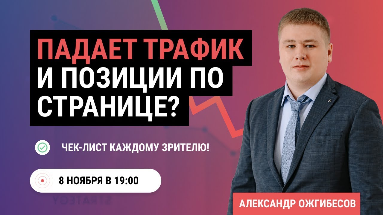 8 ноября в 19:00 по МСК, Александр Ожгибесов проведет новый вебинар. В прямом эфире я расскажу о ситуации, когда падает трафик и позиции у сайта или страницы. Что делать оптимизатору, когда позиции сайта снижаются. Как остановить падение сайта по трафику? Будет жарко! ? Предлагайте ваши темы в комментариях и возможно, что именно она попадет на разбор в вебинар. ? Обязательно нажмите на колокольчик на ютубе, чтобы получить уведомление о старте трансляции! ??? Если понравилось видео, ставьте лайк, подписывайтесь на канал, здесь Ожгибесов рассказывает про полезное в SEO! ? Продвижение сайтов: https://ozhgibesov.net/ ? Контакты: seo@ozhgibesov.net https://vk.com/aozhgibesov Telegram: [id21566179|@AOzhgibesov] https://www.facebook.com/aozhgibesov #seo #ожгибесов #трафик