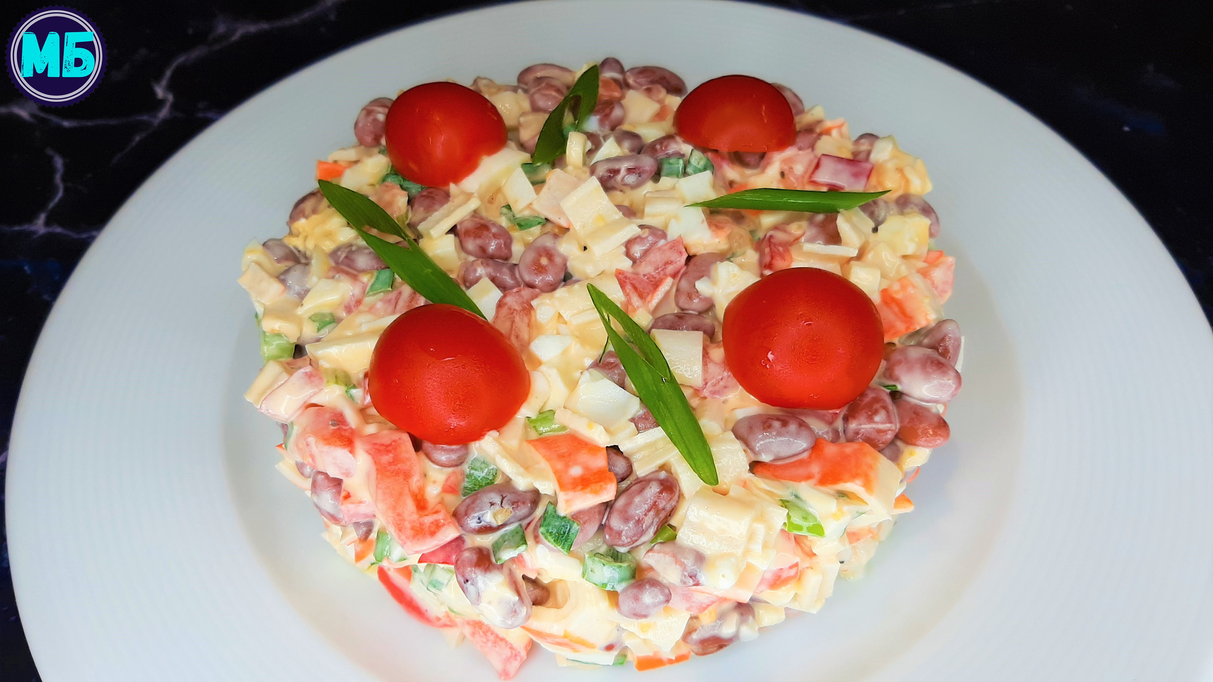 фасоль консервированная (красная) 400 гр. перья зеленого лука (3 луковицы) перец болгарский 1/4 часть крабовые палочки 200 гр. яйца 4 шт. помидор 1 шт. чеснок 1 зубчик сметана 1 ст.л. майонез 1 ст.л. соль по вкусу (1\3 ч.л.) молотый черный перец по вкусу украсить по вкусу