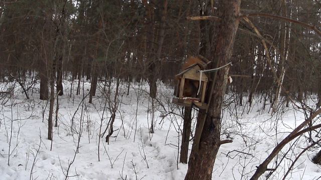 Кормушка для птиц в лесу.[Feeder for birds in the forest.]