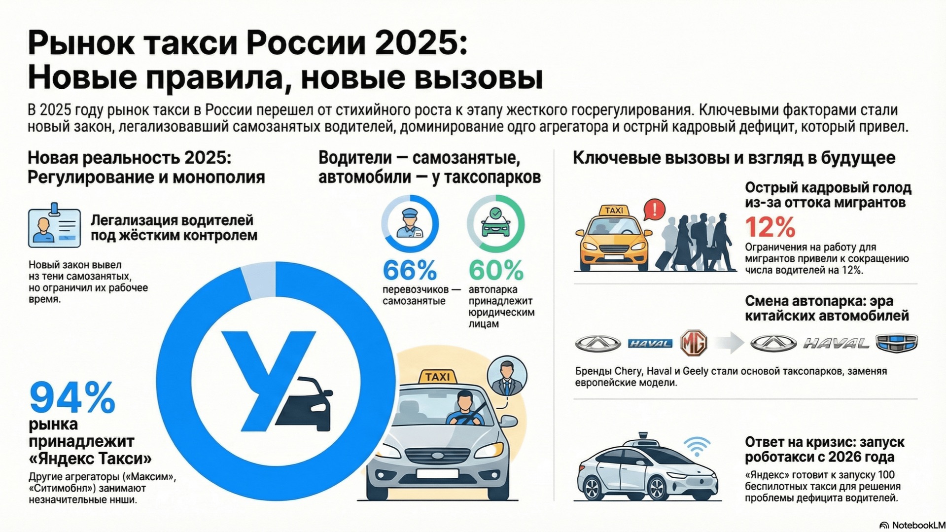 Документ анализирует состояние российского рынка такси в 2025 году, отмечая его трансформацию от стихийного цифрового роста к жесткому государственному регулированию и технологической интеграции. Ключевым изменением стало полноценное функционирование Федерального закона № 580-ФЗ, легализовавшего самозанятых водителей, которые теперь составляют большинство зарегистрированных перевозчиков. Несмотря на численное преобладание самозанятых, основная часть автопарка (более 60%) по-прежнему сосредоточена у юридических лиц, что подчеркивает их роль как основных арендодателей транспортных средств. Регуляторная среда 2025 года характеризуется упрощенным налогообложением и бонусами для самозанятых, а также ужесточением контроля за безопасностью, включая обязательные ограничения рабочего времени водителей. Рынок агрегации демонстрирует крайнюю степень концентрации: «Яндекс Такси» занимает более 94% федерального рынка, формируя стандарты в отрасли. Другие игроки, такие как «Максим», удерживают нишевые позиции, а доли «Ситимобил» и «Таксовичкоф» значительно сократились, что свидетельствует о завершении эпохи многоплатформенной конкуренции. Одной из острейших проблем является кадровый голод, вызванный ужесточением миграционного законодательства и конкуренцией со смежными секторами, что привело к прекращению «Яндексом» сотрудничества с водителями-мигрантами по патентам. Эта трансформация подчеркивает превращение рынка такси в критически важный элемент цифровой экономики, требующий адаптации к новым правовым нормам, дефициту ресурсов и изменению архитектуры авторитейла. #РоссийскийРынокТакси #ИндустрияТакси2025 #Госрегулирование #СамозанятыеВодители #ДоминированиеЯндексТакси #КонсолидацияРынка #ДефицитКадров #ЦифроваяЭкономика документ - https://t.me/autoanalitic подписаться - https://t.me/arxivpaperu отправить донаты: USDT: 0xAA7B976c6A9A7ccC97A3B55B7fb353b6Cc8D1ef7 BTC: bc1q8972egrt38f5ye5klv3yye0996k2jjsz2zthpr ETH: 0xAA7B976c6A9A7ccC97A3B55B7fb353b6Cc8D1ef7 SOL: DXnz1nd6oVm7evDJk25Z2wFSstEH8mcA1dzWDCVjUj9e создано с помощью NotebookLM