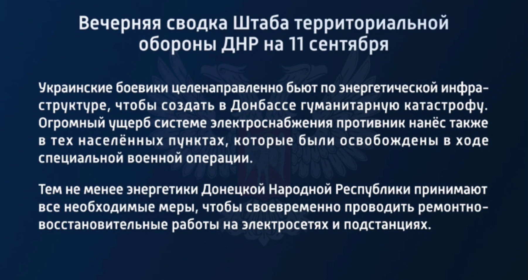 Вечерняя сводка Штаба территориальной обороны ДНР на 11 сентября 2022 года
