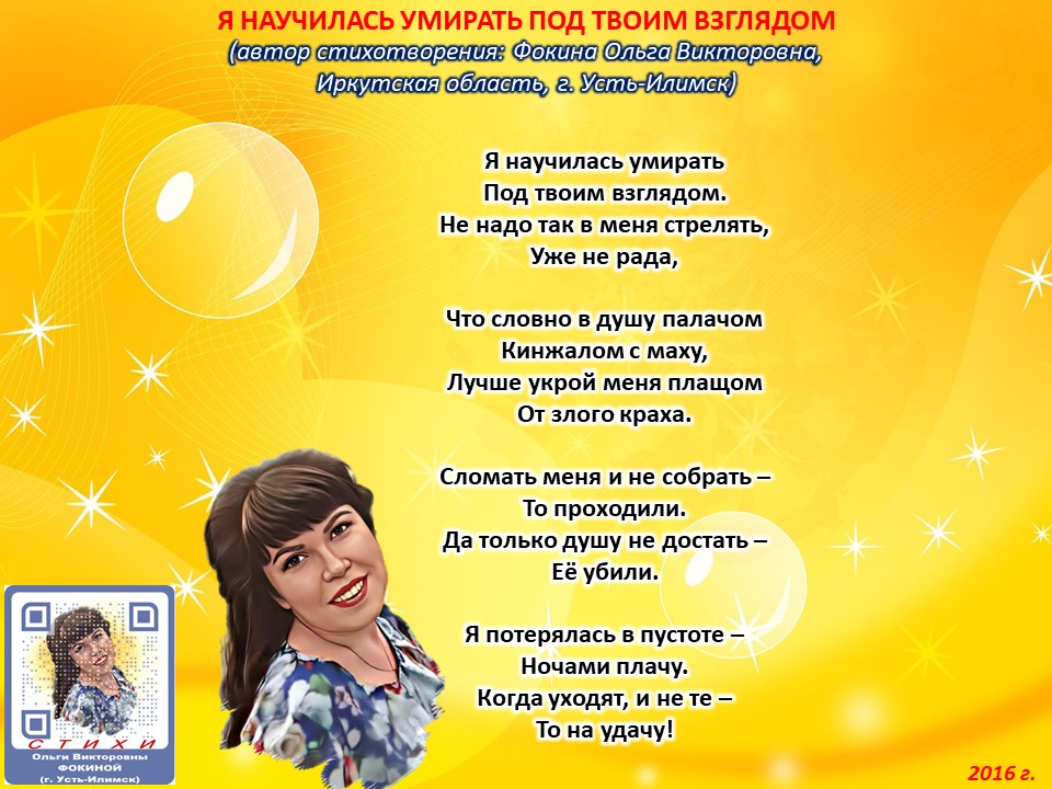 Читает автор стихотворения: ФОКИНА ОЛЬГА ВИКТОРОВНА (Иркутская область, город Усть-Илимск) СТИХИ: https://stihi.ru/2018/07/08/3790 БИОГРАФИЯ: http://www.proza.ru/2019/10/08/1473 ВЫИГРЫВАЙТЕ КНИГИ БЕСПЛАТНО: https://proza.ru/2017/09/17/447 ОТЗЫВЫ ЧИТАТЕЛЕЙ: http://www.proza.ru/2019/11/29/611 Из книги Фокиной Ольги Викторовны (Усть-Илимск) «Несу добро в ладошках!»: [все стихотворения с 2005 по октябрь 2020 гг., проза, авторские песни, интервью]. – Москва: МГО Союза писателей России, 2020 г. – 886 стр., ил. ISBN 978-5-7949-0826-8 Я НАУЧИЛАСЬ УМИРАТЬ ПОД ТВОИМ ВЗГЛЯДОМ (автор стихотворения: Фокина Ольга Викторовна, Иркутская область, г. Усть-Илимск) Я научилась умирать Под твоим взглядом. Не надо так в меня стрелять, Уже не рада, Что словно в душу палачом Кинжалом с маху, Лучше укрой меня плащом От злого краха. Сломать меня и не собрать – То проходили. Да только душу не достать – Её убили. Я потерялась в пустоте – Ночами плачу. Когда уходят, и не те – То на удачу! 15 апреля 2016 г.