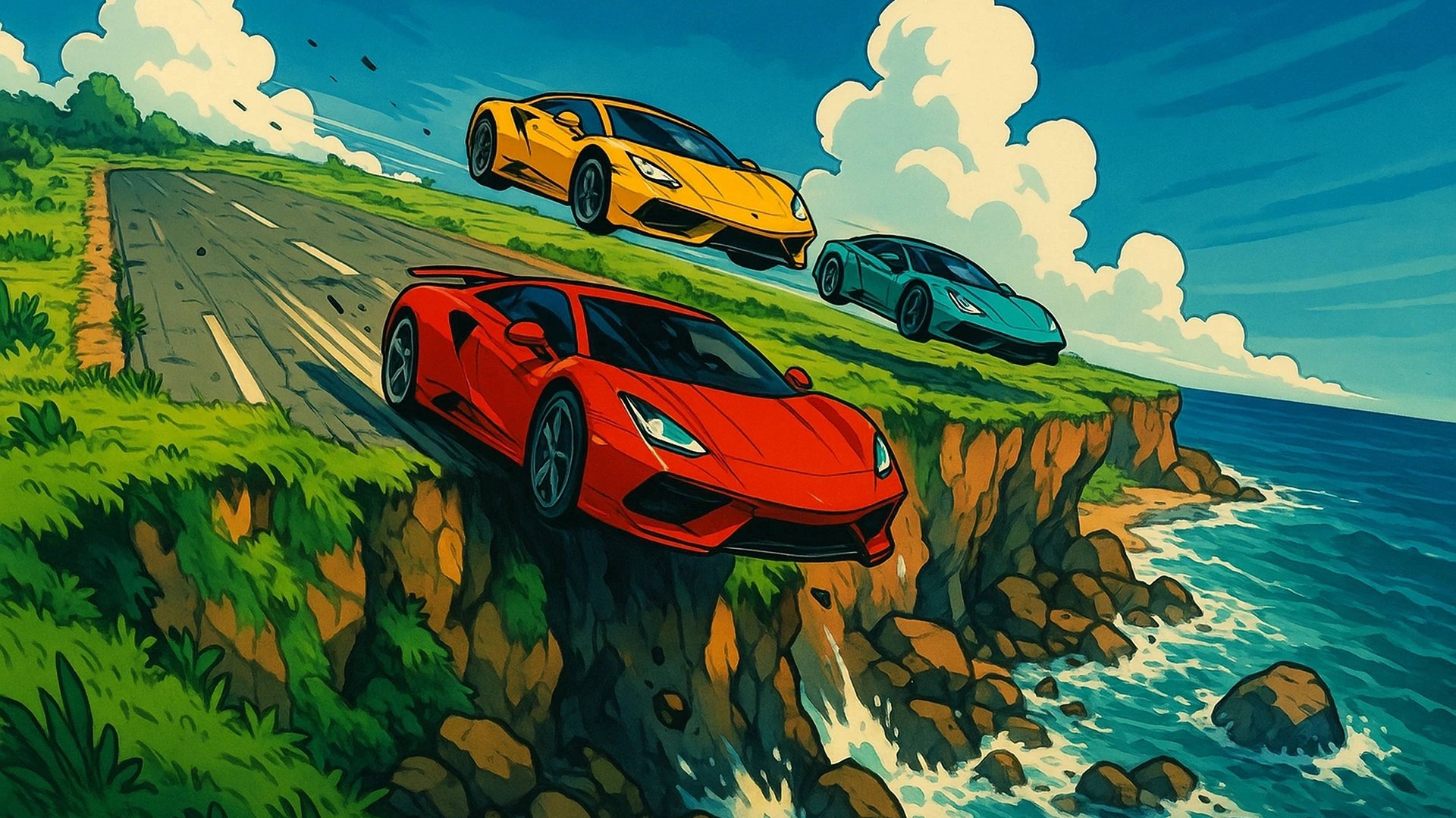 Мультики про машинки. Суперкары едут по взлетной полосе заброшенного аэродрома и падают с обрыва.