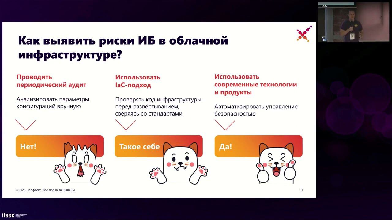Neoflex стал партнером форума «ITSEC 2023: информационная и кибербезопасность России», где эксперты обсудили новые технологии, методы и инструменты для защиты информации и предотвращения кибератак. На мероприятии выступил Евгений Кондратьев, лидер продукта NeoCAT, с докладом на тему «Cloud Native технологии для управления безопасностью в облаке». Эксперт отметил такие риски в публичном облаке, как возможность утечки данных в сеть, открытые IP, незащищенные порты, ошибки конфигурации ресурсов. В частности, рассказал о том, как облака помогают ИБ шифровать данные при их передаче и хранении, контролировать и разделять права доступа, управлять уязвимостями, а также обеспечивать прозрачность и контроль изменений. Спикер отметил важность использования современных технологий, чтобы автоматизировать анализ ресурсов и управление их безопасностью. Он рассказал о подходе CSPM (Cloud security posture management), который позволяет непрерывно выявлять и приоритезировать риски, а также обеспечивать соответствие инфраструктуры требованиям и стандартам безопасности.