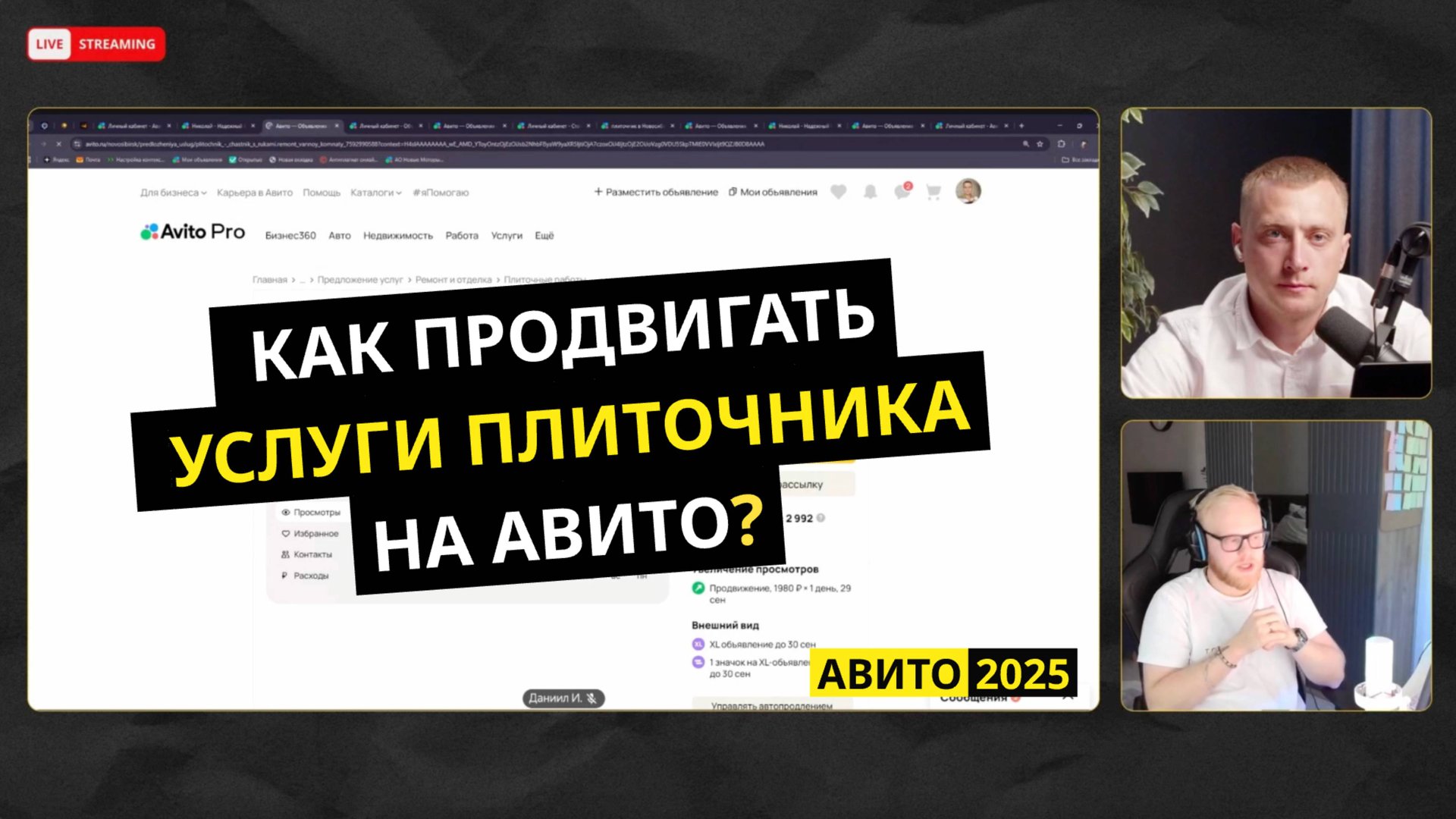 🎥 Экспертный вебинар: Как продвигать услуги плиточника на Авито В этом эфире мы разбираем нишу плиточных работ и показываем, как мастера и компании могут находить клиентов через Авито. Поговорим о стратегии продвижения, спросе в разных городах, цене лида и реальных результатах. Гость: Даниил Иванов — специалист по продвижению бизнеса на Авито, работает с услугами. На эфире делится методологией по продвижению мастеров по укладки плитки и кафеля. Вебинар будет полезен плиточникам, ремонтным компаниям и маркетологам, которые хотят освоить продвижение в этой нише и получать клиентов с Авито. ⌛ Таймкоды - что разбирали: 00:00 Интро 06:49 Какой спрос в нише 12:29 Как увеличить количество клиентов в нише 13:21 Какая ЦА преобладает в нише 18:48 Что чаще - пишут или звонят? 19:28 Через сколько минут нужно отвечать, чтобы не потерять клиента 24:28 Как анализировать конкурентов перед запуском. На что стоит смотреть в первую очередь 28:57 Какие позиции в выдачи приносят трафик 31:35 Как попасть в рекомендации 36:52 В чем заключается стратегия продвижения в нише 40:34 Почему в услугах очень важно покупать тариф 42:47 Фишки, которые реально работают 55:22 Какой эффект, в цифрах, дает автоматизация на Авито 58:04 Пример удачного контента под нишу 1:02:52 Что точно не стоит делать в продвижении 1:08:20 Как модернизировать свои навыки Авитологу 1:12:03 Частник или компания. Какой аккаунт лучше в нише? 1:14:11 После публикации объявления не получают просмотров, как его реанимировать? 1:14:41 Сколько времени требуется, чтобы новое объявление вышло на стабильный охват? 1:16:31 Нужно ли прогревать новые аккаунты? 1:19:52 Как объяснять клиенту тот факт, что в объявлении написано - частный мастер, а по факту у вас бригада или компания? 1:24:33 Какой бюджет в день необходим в городах миллионниках 1:25:44 Почему клиенты готовы ждать услугу 2-3 месяца Если есть вопросы по темам эфира — пишите в комментариях, разберём в следующих выпусках. Нужен проверенный АВИТОЛОГ? Оставьте заявку по ссылке → https://b2bhelp.ru/7nBxOq Моя команда поможет найти специалиста, который знает вашу нишу и умеет приводить клиентов. Если Вы — Авитолог и хотите попасть в наше закрытое комьюнити Авитологов, заполняйте анкету по ссылке https://salebot.site/community_avitologov_1 Я лично с каждым проведу видео интервью, проверю вашу компетентность и, возможно, Вы пополните ряды правоверных Авитологов. Ищите помощь и единомышленников в продвижении на Авито? 👉 Вступайте в наш бесплатной телеграмм чат "взаимоПОМОЩИ", нас более 16 000 участников, присоединиться по ссылке https://t.me/+eAAs5VDiwihjNWFi --- Ларцев Иван, действующий предприниматель, основатель платформы http://b2bhelp.ru и эксперт по привлечению клиентов с Авито #Авито #B2BHELP