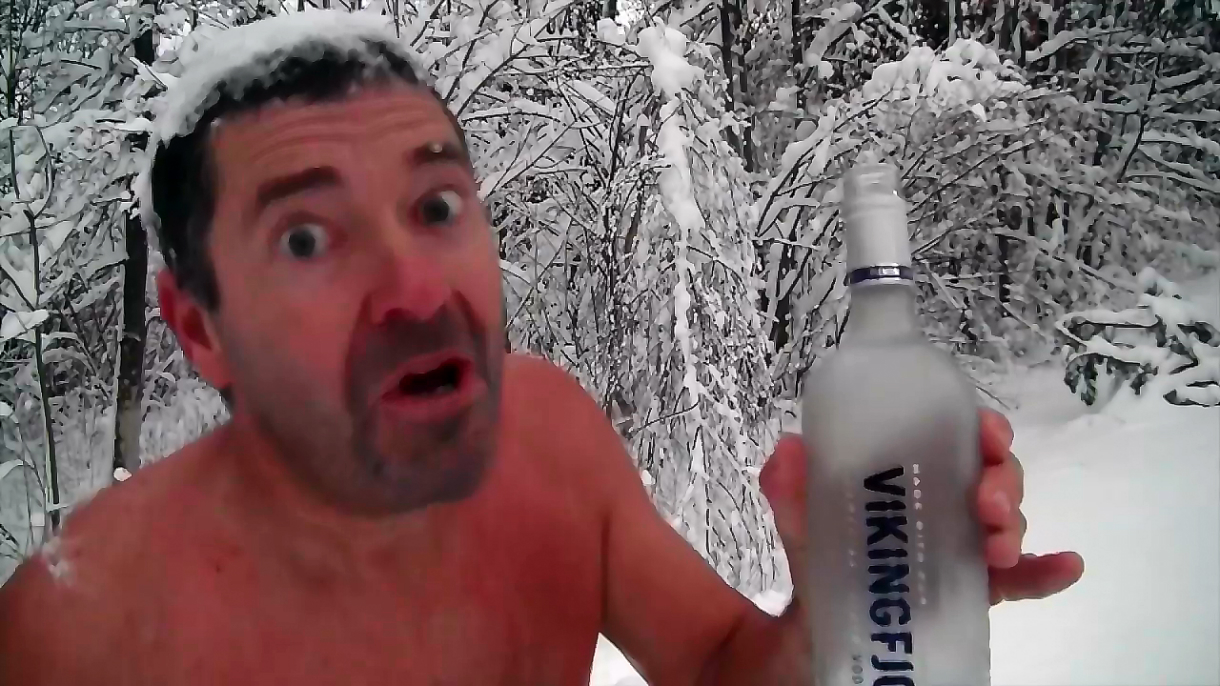 В начале видео мужик в одних трусах идёт по заснеженному лесу с бутылкой водки. После этого он бензопилой распиливает лёд в ванне и ложится туда сам
