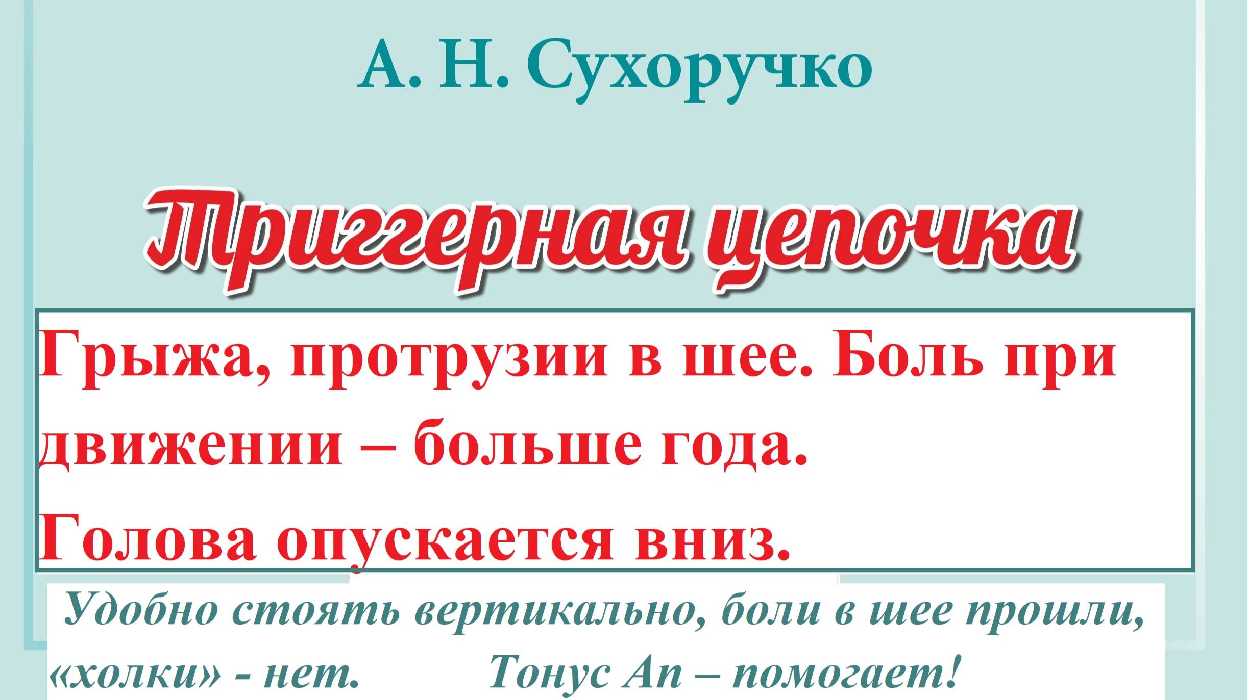 Грыжа, протрузии в шее. Боль при движении – больше года. Голова опускается вниз. Удобно стоять вертикально, боли в шее прошли, «холки» - нет. Тонус Ап – помогает! "Триггерная цепочка" Сухоручко А.Н. - это русская инновация оздоровления организма, без: неврологии, лекарств, МРТ, УЗИ, нейрохирургии, остеопатии, мануальной терапии, костоправства, тренажёров. Триггерная цепочка устанавливает диагноз, определяет тактику оздоровления и профилактики; устраняет боли, головокружение, онемение; восстанавливает и укрепляет работу позвоночника, суставов; вертикализирует осанку. Почувствуй легкость, энергию, силу — без мигрени, грыжи диска, остеохондроза, невралгий, артроза, сколиоза, панической атаки! Подробней читать в книге А.Н. Сухоручко "Триггерная цепочка. Энциклопедия здоровья позвоночника и суставов" / сайт сухоручко.рф