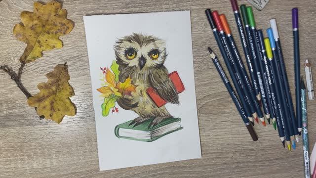 Сова - символ мудрости и знаний. В этом видео вы увидите как нарисовать открытку к празднику при помощи акварели и акварельных карандашей