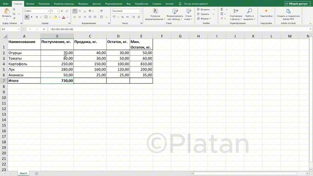 Как в Excel (эксель) посчитать сумму? Этим вопросом задаются многие пользователи сети. Статистика запросов на тему "Как посчитать сумму в эксель" или "Как в экселе посчитать сумму строки и столбца" - около 40 000 запросов в месяц. Читать статью https://dzen.ru/a/acoiuPHlE0G_KdG0 Есть несколько способов посчитать сумму в документе эксель. Например с помощью арифметической формулы, кнопки «Автосумма» или функции СУММ. Выбор способа зависит от задачи: для небольших расчётов подходит арифметическая формула, для быстрого суммирования подойдет Автосумма, для сложения чисел в диапазоне функция СУММ. Также существует множество вариантов функции СУММ - СУММЕСЛИ, суммирует ячейки соответствующие заданному условию, и СУММЕСЛИМН, суммирует ячейки соответствующие заданному набору условий. Рассмотрим первые три варианта. Итак, у нас есть таблица из нескольких столбцов и строк. Мы хотим понять, сколько всего килограммов продуктов поступило на склад. Ставим курсор в ячейку B7, вводим знак равенства и выделяем ячейку B2. Далее вводим знак сложения, и выделяем ячейку B3 и так далее. После того, как выделим последнюю ячейку в нужном диапазоне, у нас это B6, нажимаем Энтер. Как видно, значения ячеек суммировались. Это можно проверить выделив этот же диапазон. Встать в ячейку B2, и с зажатой левой кнопкой мышки протянуть до B6. При этом в нижней информационной строке отобразится сумма выделенного диапазона, количество выделенных ячеек и среднее арифметическое значение. Этот способ трудоемкий, и больше подходит для суммирования значений в двух соседних ячейках. Самый быстрый способ простого суммирования значений в столбце или строке документа Excel - встроенная функция "Автосумма". Достаточно выделить ячейку, в которой нужно получить результат, в нашем случае C7, и нажать кнопку "автосумма" в верхнем меню на вкладке редактирование. И третий способ - функция СУММ. Это почти тоже самое что и автосумма, но здесь можно выбрать не весь столбец, а необходимые ячейки. Поставим курсор в ячейку D7, введем знак равенства и наберем на русской раскладке СУММ прописными буквами. После выбираем первую ячейку, у нас это D2. Далее с зажатой клавишей КОнтрл выбираем нужные ячейки. D4 и D5 и жмем энтер. Как видите, посчитана сумма значений в выбранных ячейках.