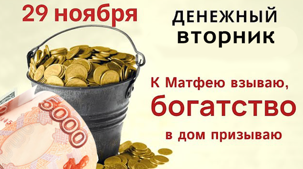 29 ноября Матвеев день. Сегодня если попросишь у Матфея достатка, обязательно получишь, и я расскажу как сделать денежный амулет и как улучшить энергетику дома, расскажу об именинниках, о лунном и о солнечном календаре на 29 ноября. Всем приятного просмотра и хорошего вечера. О, преславный апостоле Матфее, душу за Христа предавший и кровию твоею пажить Его удобривший! Услыши чад твоих молитвы и воздыхания, сердцем сокрушенным ныне приносимыя. Се бо беззаконьми омрачихомся, и того ради бедами, якоже тучами, обложихомся, елеа же добраго жития обнищахом зело, и не возможем противитися волком хищным, иже расхищати наследие Божие дерзостно тщатся. О, сильний! Понеси немощи наша, не отлучайся духом от нас, да не разлучимся й конец от любве Божия, но крепким заступлением твоим нас защити, да помилует Господь всех нас молитв твоих ради, да истребит же рукописание безмерных грехов наших, и да сподобит со всеми Святыми блаженнаго Царствия и брака Агнца Своего, Емуже честь и слава, и благодарение и поклонение, во веки веков. Аминь." Для ритуала на достаток. "К Левию Матфею взываю, богатство в дом призываю. Пусть откроются двери и достаток впустят. Аминь". Утренний заговор. "Как задумано - так и исполнится, жизнь моя счастьем наполнится". Заговоры на уборку. "Высшие Силы, прошу, благословите, мне в уборке на помощь придите. В мои руки силу добавьте, мой дом от грязи избавьте." "Подметаю, убираю, на веник худое собираю." Заговор на удачу во вторник. "Вторник принесет удачу, верю в это, помощь Бога всегда со мной!" Молитва Архангелу Гавриилу. "Святой Архангел Гавриил, подари мне радость, отгони из жизни моей печали, наполни сердце моё любовью и трепетом. Благослови на подвиги и добрые свершения. Защити меня от лукавого да не оставь меня в одиночестве на пути к свету и истинной вере. Да простит Господь мою душу. Аминь!"