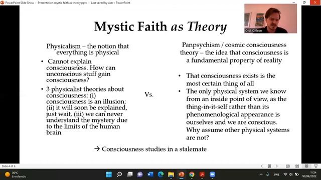My presentation on "mystic faith as theory" for the 2022 annual meeting of the American Anthropological Association, Nov 9-13, as a view on demand talk (nr. 0-210). Drawing on field research within the Transcendental Meditation movement, I briefly outline the case in favor of cosmic consciousness theory and argue for a more serious engagement with the "mystical evidence regime" of knowing by experiencing; that is exploring the self and the external world by means of consicousness in its altered states.