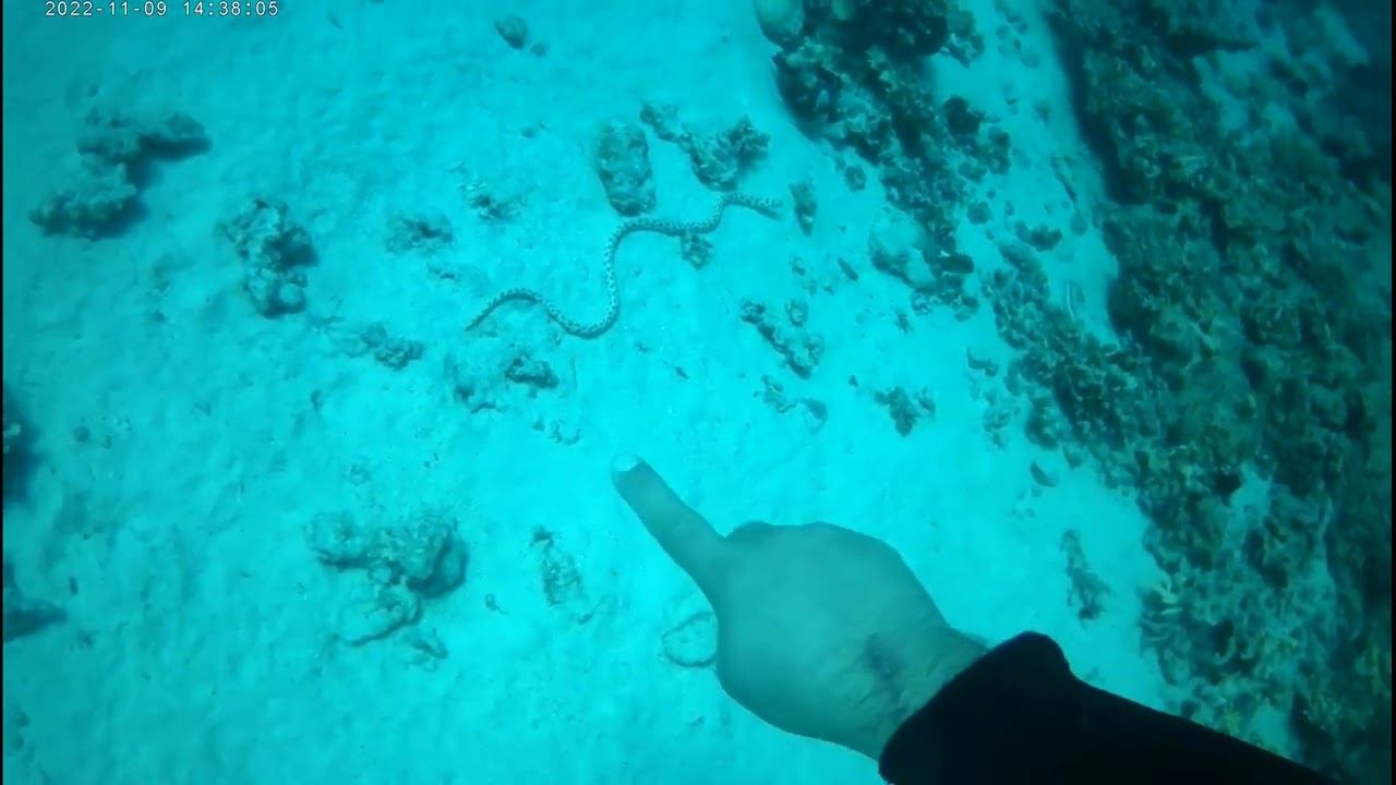 Погружение на дно Красного моря морская змея. sea snake, diving