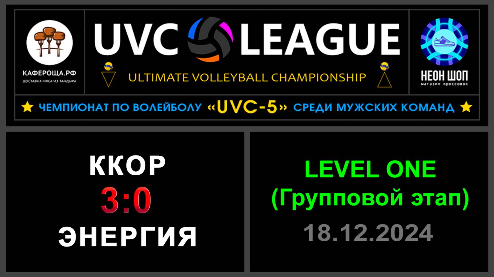 UVC-5 (Мужчины): Чемпионат UVC Лиги по волейболу среди мужских команд, 2024-2025 гг. Результаты игры: LEVEL ONE (Групповой этап) 18.12.2024 ККОР - Энергия 3:0 (25:19, 26:24, 25:22) Конкурс «Робин Гуд»: ⛔Точных попаданий не было! #UVC_ЛИГА_ЧЕМПИОНАТ_UVC_5_Мужчины