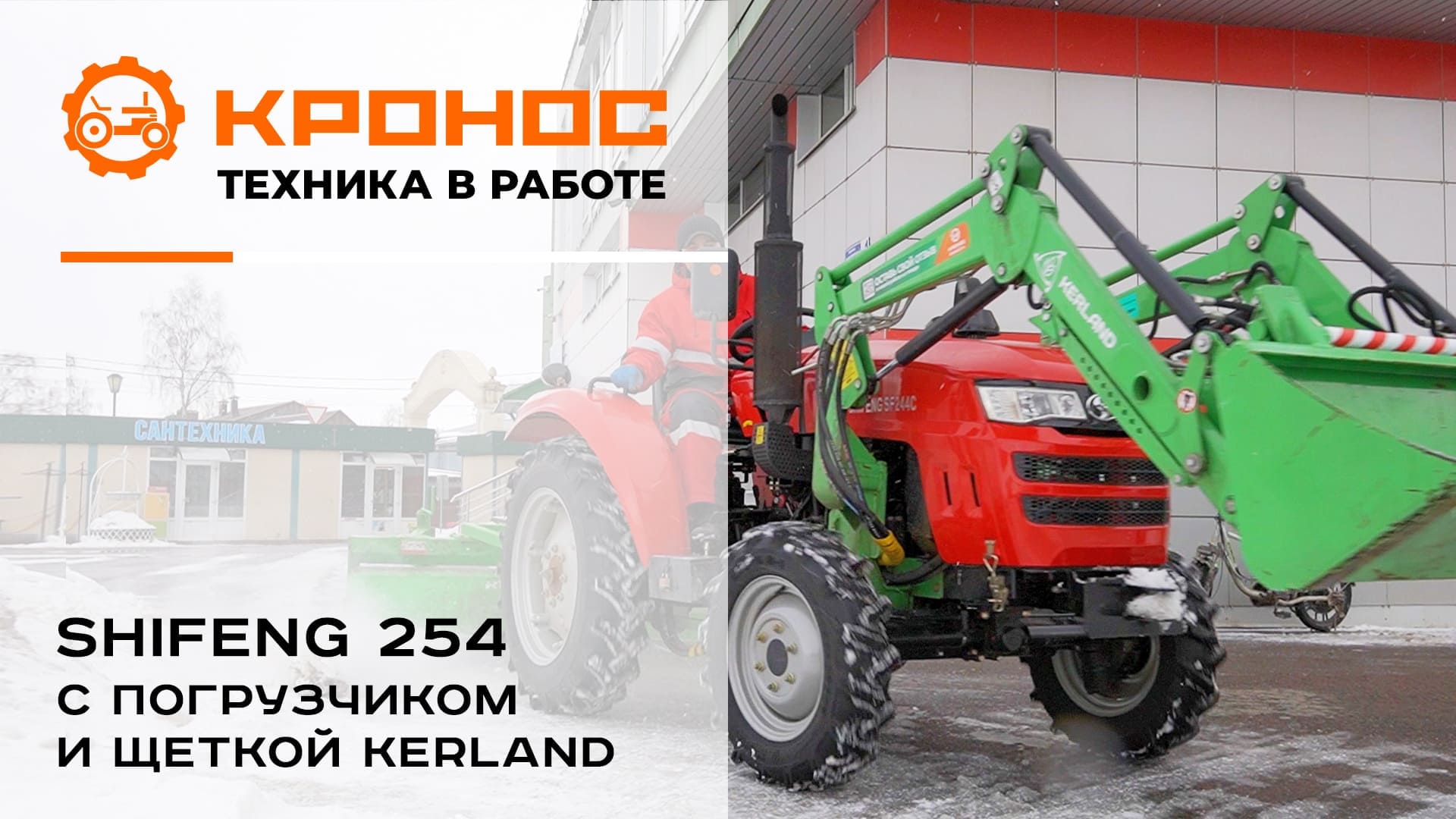 Трактор Shifeng 254 с фронтальным погрузчиком и щеткой Kerland в работе
