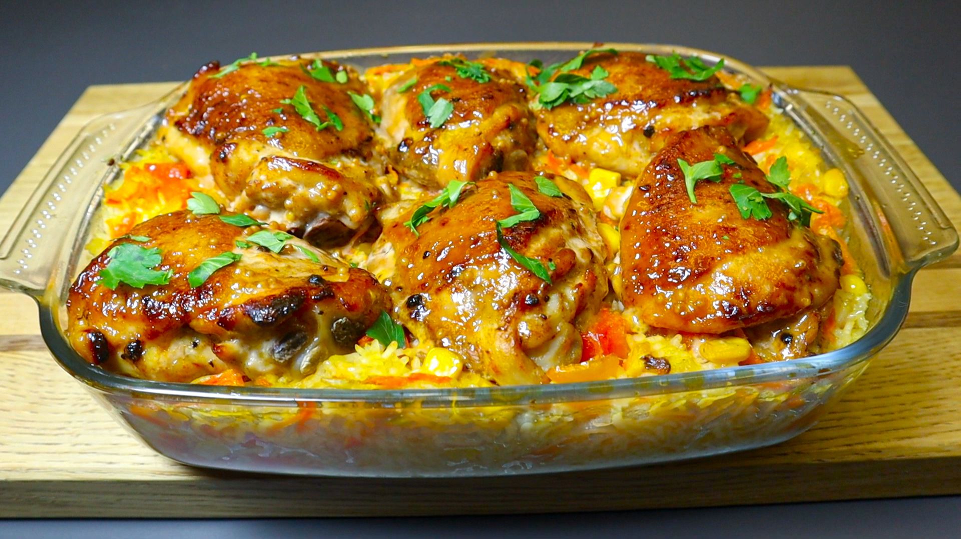 Вкуснейшая курица с рисом, которая понравится вашей семье. Просто и аппетитно! Добрый день! Сегодня мы приготовим вкусный ужин с курицей и рисом. Рецепт для семейного ужина. - куриные бедрышки 6 шт. - соль. - черный молотый перец. - паприка. - растительное масло. - обжариваем до золотистой корочки с обеих сторон. - лук. - 2 зубчика чеснока. - обжариваем 2 минуты. - морковь. - сладкий перец. - обжариваем 3 минуты. - консервированная кукуруза 100 г. - соль + карри. - 1 стакан риса. - майонез 2 ст.л. + соус чили 1 ч.л. - Французская горчица 1 ч.л. - мед 1 ч.л. + соевый соус 20 мл. - 350 мл куриного бульона. - ставим в духовку на 30 минут при температуре 180°C. - ставим в духовку на 10 минут при температуре 180°C. - Посыпаем петрушкой. Наш ужин готов! Если вам понравилось, пожалуйста, поставьте лайк, подпишитесь и напишите комментарий!
