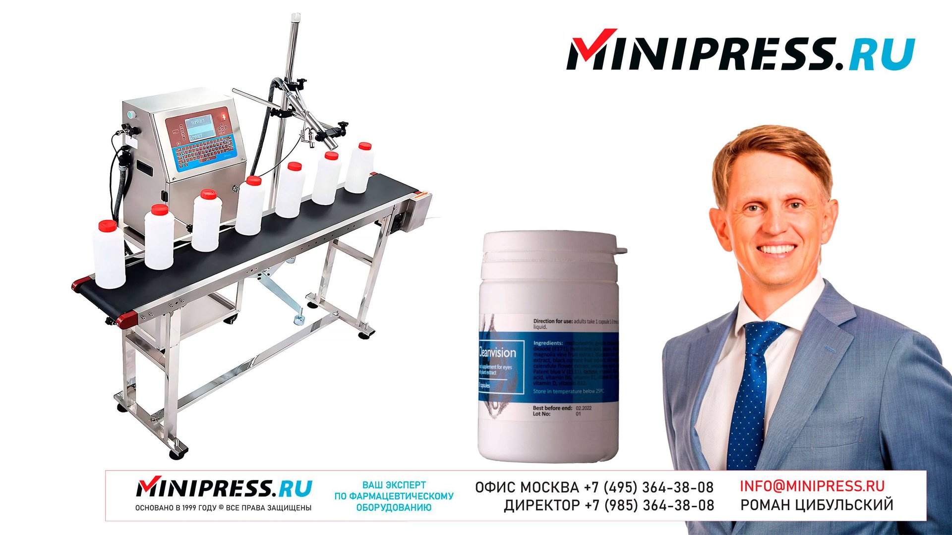 Промышленный струйный принтер печати даты и QR кода LV-09 https://Minipress.ru/katalog/ Фармацевтическое оборудование. Специалисты в фармацевтическом оборудовании и технологиях производства лекарств. Более 20 лет оказываем нашим клиентам помощь в выборе, поставке, наладке различного фармацевтического оборудования! Вы в поиске надежного поставщика оборудования? Мы предоставим вам лучший сервис 24/7. Собрана лучшая команда профессионалов в фармацевтической отрасли и налажены стабильные связи с лучшими производителями. Мы не только продаем, но и производим многие модели оборудования Директор компании Минипресс Роман Цибульский Поставка фармацевтического оборудования в Россию Пишите: info@minipress.ru Телефон +7(495)364-38-08; Мобильный +375(29)308-00-00 Россия, Москва Skype: RomanTsibulsky; ICQ: 310-134-490 Подписывайтесь на наш видео канал на Youtube https://youtube.com/user/wwwMinipressru Обновленный сайт https://Minipress.ru Каталог оборудования https://Minipress.ru/katalog/ МЫ В СОЦИАЛЬНЫХ СЕТЯХ G+ https://plus.google.com/+RomanTsibulsky/ FB https://facebook.com/roman.tsibulsky YOUTUBE https://youtube.com/user/wwwMinipressru IN https://ru.linkedin.com/pub/roman-tsibulsky/a6/933/661 БОЛЬШОЙ КАТАЛОГ ФАРМАЦЕВТИЧЕСКОГО ОБОРУДОВАНИЯ https://minipress.ru/katalog/ Постоянно обновляемый каталог различного фармацевтического оборудования с фотографиями, описаниями, видео и ценами. ПЕРСОНАЛЬНЫЙ МЕНЕДЖЕР 24 ЧАСА https://minipress.ru/katalog/ Вы общаетесь по всем вопросам, с момента первой консультации и до получения оборудования, с одним специалистом. СПЕЦИАЛИСТЫ И ТЕХНОЛОГИ https://minipress.ru/katalog/ Имеем обширные связи в фармацевтической среде, найдем любого специалиста, поможем с освоением оборудования и технологий. ОБСУЖДЕНИЕ ВАШИХ ИДЕЙ ПО ПРОИЗВОДСТВУ ПРОДУКЦИИ https://minipress.ru/katalog/ Поможем в оценке ваших идей. Большой опыт в организации различных производств и выпуске продукции. Ценные советы. ФАРМАЦЕВТИЧЕСКОЕ ОБОРУДОВАНИЕ Мы поставили перед собой задачу, помогать нашим клиентам в правильном выборе фармацевтического оборудования. Многолетний опыт подобной деятельности показывает, что многие клиенты сталкиваются, в первую очередь, с непониманием технологического процесса. Покупка оборудования должна быть финальной точкой после подробного обсуждения задачи, консультацией с производителем оборудования, отправкой сырья и материалов на фабрику, тестирования в работе. ДЛЯ ТАБЛЕТОК https://minipress.ru/katalog/category/farmacevticheskoe_oborudovanie/ Смешивание порошков, гранулирование, прессование, обеспыливание, покрытие оболочками, фасовка, упаковка, счет, нанесение логотипов ДЛЯ ЖЕЛАТИНОВЫХ КАПСУЛ https://minipress.ru/katalog/category/farmacevticheskoe_oborudovanie/kapsulyatory-dlya-tverdyh-zhelatinovyh-kapsul/ Фасовка порошков и масел, обеспыливание, счет и фасовка, упаковка, нанесение логотипов. ФАСОВКА И УПАКОВКА https://minipress.ru/katalog/category/upakovochnoe_oborudovanie/ Упаковка в пластиковые и стеклянные флаконы, блистер, фольгу, ламинированную бумагу, стеклянные ампулы, саше, стрипы, тубы, тюбики, контурную ячейку. ТЕХНОЛОГИЧЕСКОЕ https://minipress.ru/katalog/category/eksperimentalnoe-oborudovanie/ Лабораторное, аналитическое, подготовительное, отдельные машины и линии под ключ. СФЕРЫ ДЕЯТЕЛЬНОСТИ Наша компания занимается множеством направлений фармацевтического бизнеса! Предлагаем Вам посетить страницы нашего сайта https://www.Minipress.ru по различным специализациям. ОБОРУДОВАНИЕ ДЛЯ НАКЛЕЙКИ ЭТИКЕТОК НА БУТЫЛКИ АМПУЛЫ ФЛАКОНЫ https://minipress.ru/katalog/oborudovanie-s-otzyvami/oborudovanie-dlya-naklejki-etiketok-na-butylki-ampuly-flakony/ Автоматическое этикетировочное оборудование для этикеток на клеевой ос