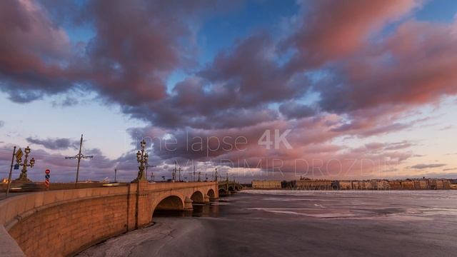 Russia, Saint-Petersburg, 19 March 2016: Time-lapse of the Troitskiy Bridge at sunset