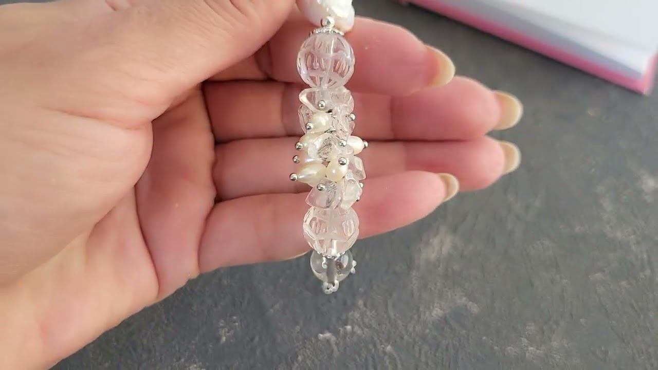 Браслет украшения из натуральных камней. Браслет гроздь из жемчуга барокко, жемчуга, горного хрусталя: жемчуг барокко 16х22 мм., жемчуг рис 6 мм., горный хрусталь галтовка мелкая, шарик 10 мм., шарик резной «бутон» 12 мм., фурнитура люкс покрытие родий 14 мк., длина 18-23 см. (на запястье от 14 см.) купить украшения можно в нашем магазине https://www.livemaster.ru/samotsvety-ot-granat-mk?view=profile
