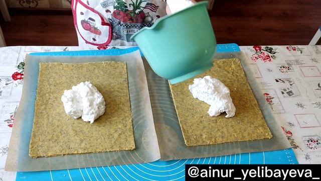 Тесто: Сары май (Сливочное масло) 82.5% - 100 гр. Желток - 3 шт. Сахарная пудра - 80 гр. Ұн (Мука) - 200 гр. Бадам ұны (Миндальная Мука) - 20 гр. Мак - 20 гр. Разрыхлитель - 5 гр. Ванилин - 1 или ванильный сахар - 5 гр. Меренга: Ақуыз (Белок) - 3 шт. Қант (Сахар) - 150 гр. Кукурузный крахмал - 10 гр. Грек жаңғағы (Грецкие орехи) - 50 гр. Жидектер ( Ягоды замороженные) - 50-70 гр. Крем: Творожный сыр - 150 гр. Сахарная пудра - 65 гр. Сливки (33-35%) - 150 гр.