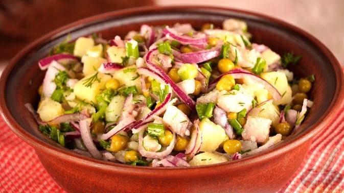 Салат из картофеля, лука, консервированного горошка и солёной сельди, заправленный подсолнечным маслом, – знакомое сочетание привычных продуктов. Картофель нужно отварить, остальное только нарезается и перемешивается. #СалатИзСелёдки #СалатИзКартофеля #КартофельныйСалат #СалатСГорошком #СалатБезМайонеза #ПростойСалат