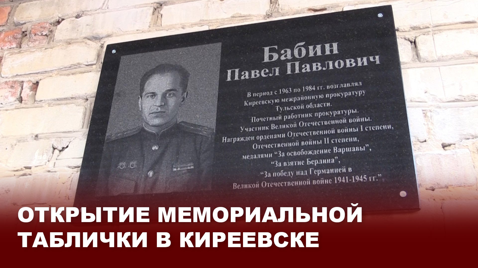 В 2022 году Российская Прокуратура отметила знаменательную дату- 300-летие со дня создания. В юбилейный год в Киреевской межрайонной прокуратуре открытием мемориальной таблички решили увековечить память Павла Павловича Бабина- почётного работника прокуратуры, участника Великой Отечественной войны, который в период с 1963 по 1984 год возглавлял Киреевскую межрайонную прокуратуру.