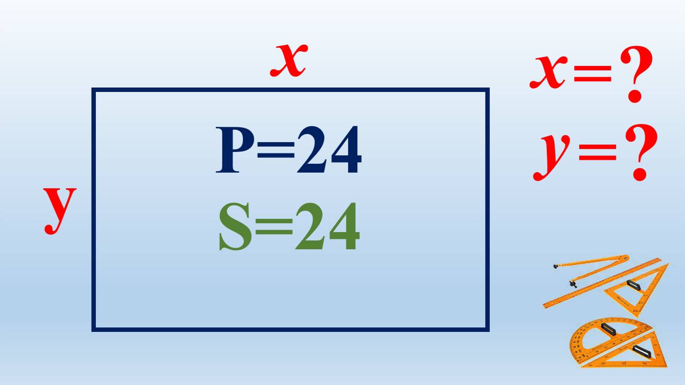 Геометрия.Тўғри тўртбурчак юзаси ва периметри маълум бўлса томонларини топингʔ S=24͵ P=24͵ x=ʔ͵ y=ʔ