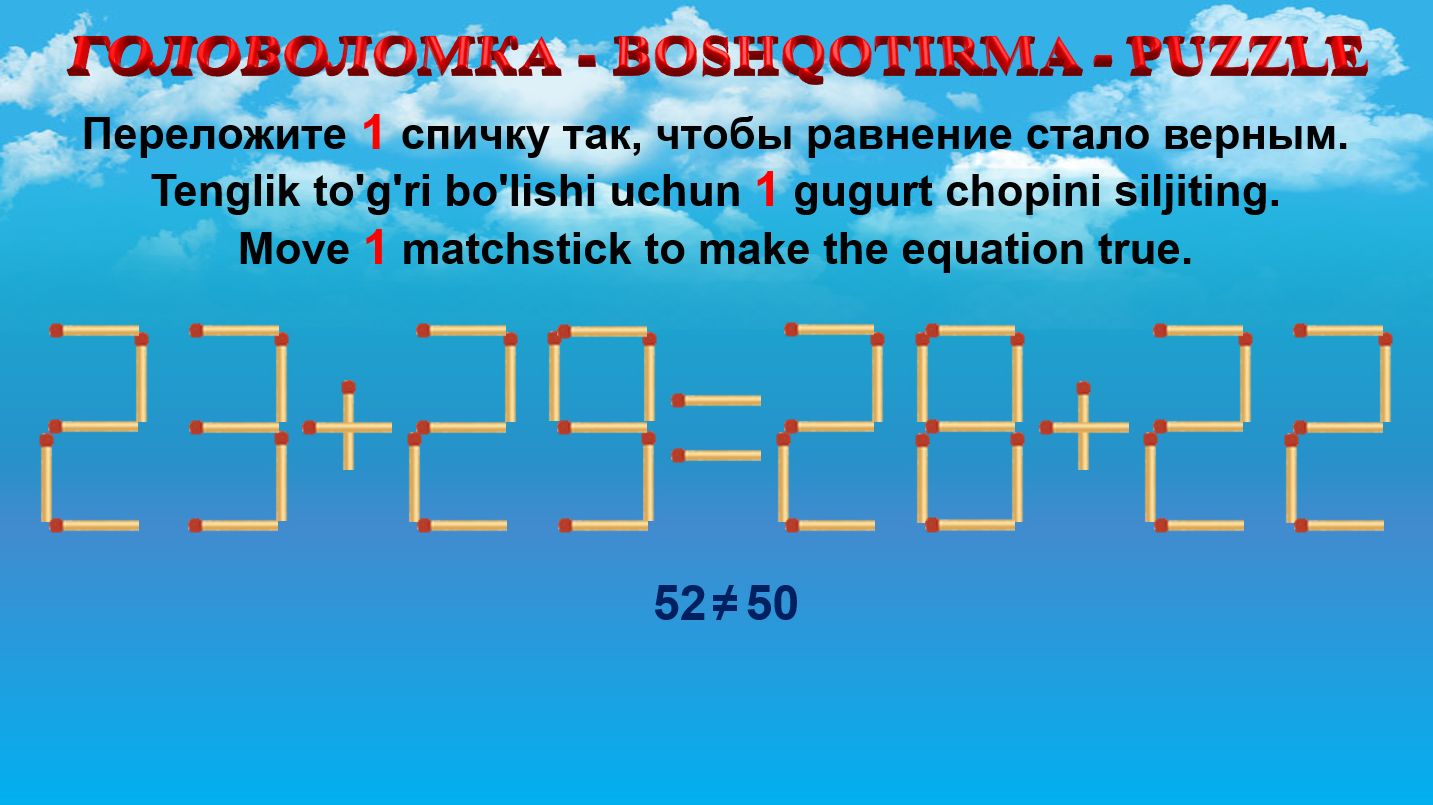 ГОЛОВОЛОМКА - BOSHQOTIRMA – PUZZLE. Спичка. 23+29=28+22, 26+29=25+28, 28+25=23+23, 24+29=28+23