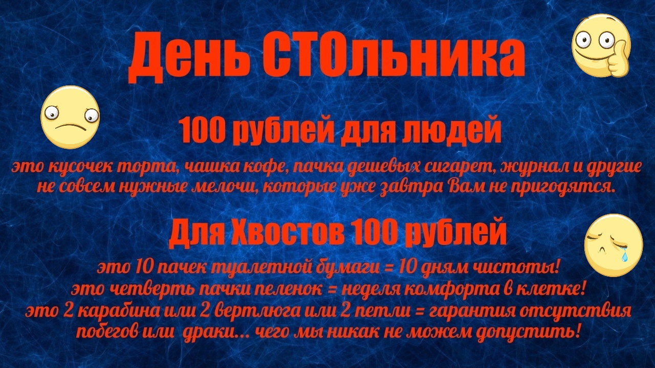 Сегодня мы проводим акцию — 100 руб. для человека — это очень не большая сумма. На нее можно купить кусочек торта, чашку кофе, пачку дешевых сигарет, журнал и другие не совсем нужные мелочи, которые уже завтра Вам не пригодятся. Для наших Хвостов это шанс дождаться хозяина в тепле и заботе, не потерять крышу над головой, ну а для нас - комфортно содержать Хвостов. У нас очень много не больших, не дорогих, нужд, на которые мы не видим смысла писать отдельно. Но в купе они накапливаются и сумма становится огромной, а жизнь и содержание животных без самых необходимых мелочей очень сложной, ибо за что ни схватись везде нужны финанасовые средства. Так например, у нас заканчиваются пеленки и даже запасы туалетной бумаги, чтобы у тех кто содержится в клетках и не доносит до улицы, какахи собирать. У нас на это дело чуть не по целому рулону в день тратится... И не с проста далеко не каждый человек хочет принять подобрав животное с улицы, а тем более привести его в дом. Кроме приятного и полезного - спасения, человека с огромной душой ждут и не столь приятные вещи. Ведь не все животные чистоплотны и умеют гулять, а кто то далеко не сразу понимает зачем его выводят на улицу или просто по своим физическим возможностям не могут этого сделать. У таких туалет в доме - результат очевиден. У нас тоже есть парочка собачек, которых нельзя содержать вне дома и они даже после прогулки могут наделать делов в доме. Ну а когда нас нет в доме, когда работаем, вообще происходит нечто... и похоже что к нам грядет ремонт. Да, в этом плане на улице животных содержать проще, но и там периодически нужны не только приборки, зимой добавляется уборка снега, а и замены и ремонты. Например, приобретение крепежей всегда актуальна. Цепи, карабины и вертлюги изнашиваются, а после зимы и часть петель у дверей под замену. Не дело крепить отпавшие двери на проволочки... Б/у обычно изношено и все надо покупать, новое. Казалось бы что все это мелочи? Только вот потребностей у нас в этих мелочах очень много! Потому что таких нужных мелочей много. Это наши постоянно текущие нужды, расходники и будем очень рады и безмерно благодарны Вашей помощи! Как можно быть уверенным в завтрашнем дне, когда и в сегодняшнем ты не уверен? Пожалуйста, помогите нам! Со всеми вопросами и предложением помощи как в содержании так и в пристройстве обращайтесь по тлф 89024792058 Елена Витальевна и 89028059780 Миша, звонить лучше вечером. Фин.помощь: Сбербанк 4279 0149 0098 6263 Елена Витальевна К. 89024792058 Альфа-банк 2200 1509 2234 6710 Любовь Вячеславовна К. 89194556276 Электронные Кошельки: Yoomoney (Я.Деньги) 410013473262323 и Qiwi +79028059780 Отчет по чекам https://vk.com/album213994132_290581704 Еще фото содержащихся у нас животных на странице в ВК https://vk.com/lena_kozlova_perm Ps: Обращаемся к жителям Краснокамского района - если у Вас ремонт, а линолеум в приличном виде на выброс - примем! Друзья, подписывайтесь на наш канал, не забывайте ставить лайки!