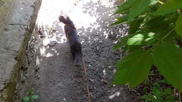 На улице хорошо, котёнок гуляет с удовольствием.