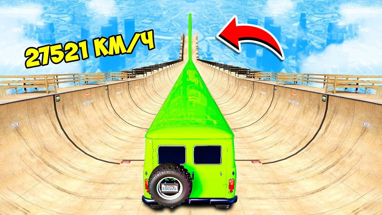 СПУСК БЕЗ ТОРМОЗОВ НА САМОМ ДЛИННОМ ЛИМУЗИНЕ УАЗ БУХАНКА ПО ТРАМПЛИНУ ГТА 5 МОДЫ РАЙЛЮХА