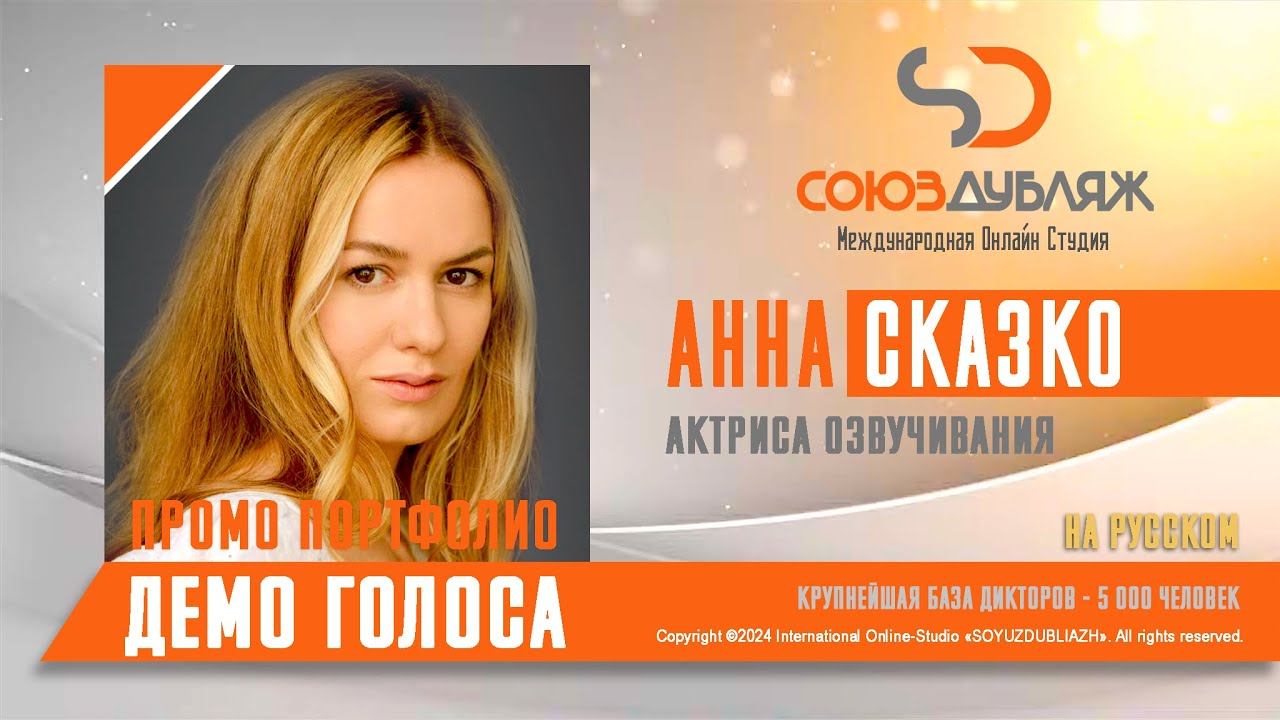 #СоюзДубляж #БазаДикторов #Озвучка ✔️Анна Сказко, диктор - актриса озвучивания. Международная Онлайн-Студия "СОЮЗДУБЛЯЖ" - профессиональная озвучка и дубляж. ▪️Рабочая группа в Телеграм: https://t.me/soyuzdubliazh ▪️Контакт для связи: https://t.me/SoyuzAdmin ▪️Подпишись:https://www.youtube.com/c/SOYUZDUBLIAZH ▪️Сайт: https://www.soyuzdubliazh.com/ Лучшие голоса для вашей аудиорекламы и видеороликов. База дикторов - 5 000 человек, профессионального уровня на ENG| FR| TR| RU| ISR| AZ| UA| KZ| UZ| языках. Мужские и Женские топовые голоса для озвучки любых проектов, таких как: Рекламы, Презентации, Фильмы, Сериалы, Игры, Мультфильмы, ТВ Шоу, Аудио-видео визитки. ✔️Сотрудничая с нами вы получаете свой проект под ключ, не выходя из дома или офиса. Наша слаженная команда из лучших дикторов, актёров озвучивания, режиссёров и звукорежиссёров в кратчайшие сроки озвучат или отдублируют ваш заказ на профессиональном уровне. Образцы работ нашего портфолио вы сможете посмотреть на канале СОЮЗДУБЛЯЖ. ВНИМАНИЕ: ✔️Мы приглашаем специалистов озвучки к сотрудничеству в нашей команде. Вы можете пройти по ссылке в наш телеграм канал и связаться с Админом для обсуждения. ✔️Всем заказчикам подобных медиа проектов по озвучки и дубляжу фильмов, сериалов, документалок обращаться непосредственно к Админу Телеграм группы СОЮЗДУБЛЯЖ, пройдя по ссылке: Проходи по ссылке: https://t.me/soyuzdubliazh International Online-Studio SOYUZDUDLIAZH presents a highly professional approach in voice-over and dubbing. ▪️Our working group https://t.me/soyuzdubliazh ▪️Chief manager https://t.me/SoyuzAdmin ▪️Follow https://www.youtube.com/c/SOYUZDUDLIAZH ▪️Web: https://www.soyuzdubliazh.com/ We offer You the best Voices for your Audio commercials and Video`s. Our Database contains over 5 000 voices of native speakers and high-class foreign language specialists in ENG| FR| TR| RU| ISR| AZ| UA| KZ| UZ|. Male & Female top level voices for all the variety of dubbing projects such as commercials, presentations, movies, TV-series, video and computer games, cartoons, TV-shows, audio & video portfolio’s – all in one place. As your business partner we guarantee a turn-key project without you leaving your house or office. Our target is to make sure that the dubbing of your project is made as quick as possible by a well-coordinated and professional team of the best speakers, film and sound directors. To whom it may concern! We invite dubbing specialists to join our team. Please contact our manager on Telegram https://t.me/soyuzdubliazh