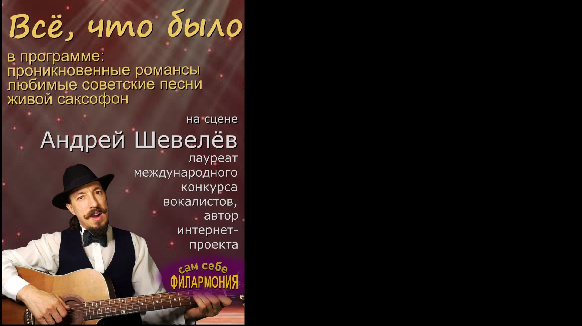 Творческий вечер Андрея Шевелёва "Всё, что было" начало в 19-00 В программе романсы, старые добрые песни и немного саксофона.