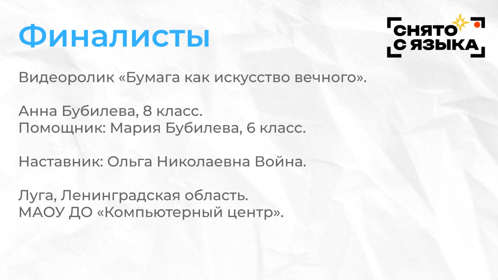 Видеоролик «Бумага как искусство вечного». Анна Бубилева, 8 класс. Помощник: Мария Бубилева, 6 класс. Наставник: Ольга Николаевна Война. Луга, Ленинградская область. МАОУ ДО «Компьютерный центр».