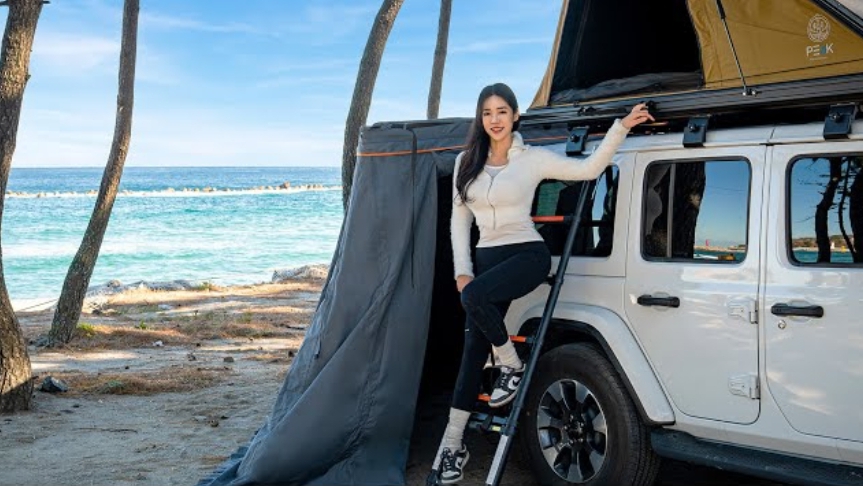 -5 градусов, зимнее море. Кемпинг в одиночестве с палаткой на крыше автомобиля.
