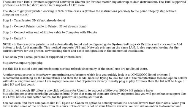 Ubuntu: How do I install my printer with Ubuntu? (2 Solutions!) Helpful? Please support me on Patreon: https://www.patreon.com/roelvandepaar With thanks & praise to God, and with thanks to the many people who have made this project possible! | Content (except music & images) licensed under cc by-sa 3.0 | Music: https://www.bensound.com/royalty-free-music | Images: https://stocksnap.io/license & others | With thanks to user Ron Krestan (https://askubuntu.com/users/40963), user Roman (https://askubuntu.com/users/221541), user Luis Alvarado (https://askubuntu.com/users/7035), and the Stack Exchange Network (http://askubuntu.com/questions/93637). Trademarks are property of their respective owners. Disclaimer: All information is provided "AS IS" without warranty of any kind. You are responsible for your own actions. Please contact me if anything is amiss at Roel D.OT VandePaar A.T gmail.com.