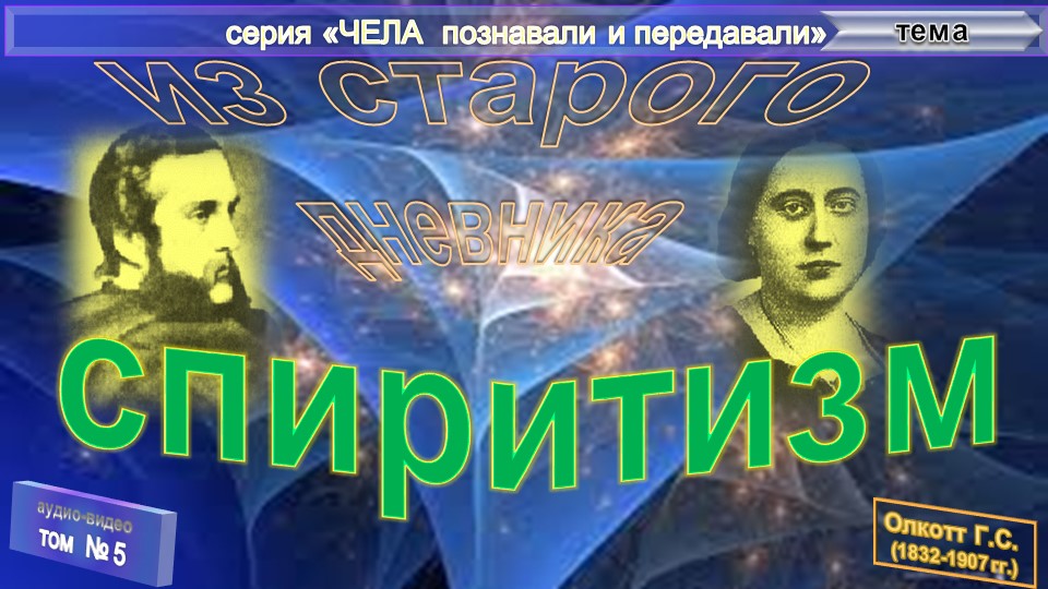 Записи из СТАРОГО ДНЕВНИКА Олкотта Г.С. (1832-1907) - соратника Е.П. Блаватской- тема 5: СПИРИТИЗМ; Генри Олкотт - один из основателей Теософского Общества, соратник и помощник Елены Петровны Блаватской (ЕПБ). Г.С. Олкотт приоткрыл завесу над таинственной личностью ЕПБ, показал всем, для общего обозрения, записи из своих дневников, её такой какой она была в каждодневных реалиях текущей жизни, в ее насущных проблемах и рутинных тяготах: со своими человеческими особенностями женского темперамента, силы и слабостей характера, терпения и нетерпимости, воли и энергии, а также и с достижениями сверхчеловеческих достоинств, способностей и талантов, преданно и самоотверженно отдавшей всё имеющееся у нее именно Служению Общему Благу Человечества - ежедневно решая и простые, и непостижимые для обывателя, простого наблюдателя, Задачи жизни, во исполнение Цели своего воплощения на Земле!