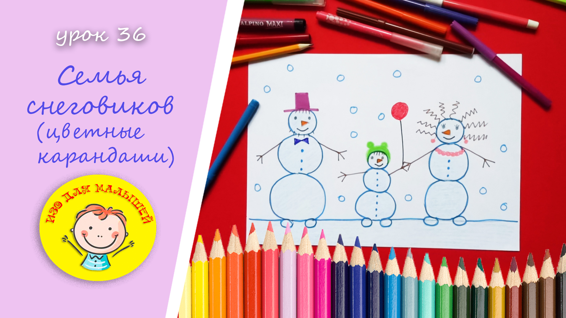 Рисуем СЕМЬЮ СНЕГОВИКОВ. УРОК 36. Тема: "семья снеговиков"- цветные карандаши