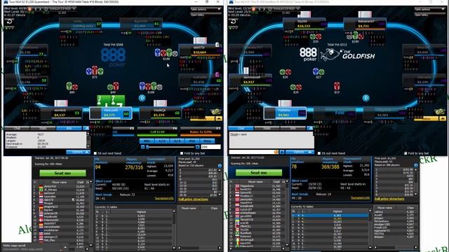 2стола MTT турниры по NL Holdem покеру : 1. Турнир $1200 Guaranteed с бай-ином $2 2. Турнир $1000 Goldfish с бай-ином $1 Результат: +$56.88 Рум: восьмерки - https://www.888.me/alexluckr