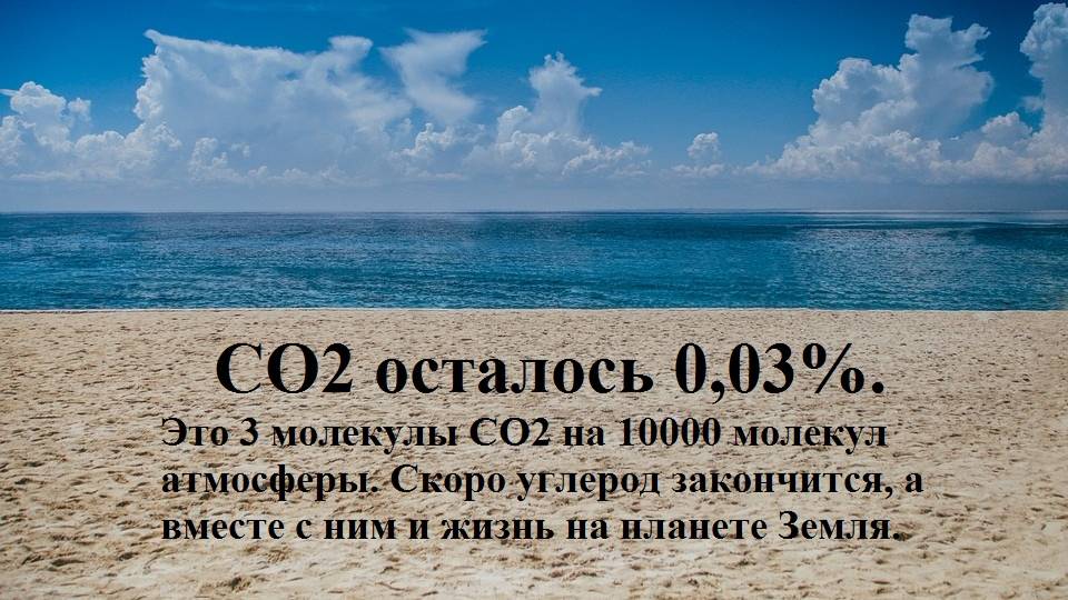 3,8 тыс. просмотров 4 года назад АННОТАЦИЯ. СО2 осталось 0,03%. Это 3 молекулы на 10000 молекул атмосферы. Скоро углерод закончится, а вместе с ним и жизненный мир на Земле. ЧАСТЬ ВТОРАЯ. Когда и как закончится жизнь на Земле? (Продолжение видео “Правда о Глобальном потеплении”) • Правда о Глобальном потеплении Как од... Прочитать "Когда и как закончится жизнь на Земле?" можно здесь http://samlib.ru/n/nikolaew_s_a/kogdaikakzakonchitsjazhiznxnazemle.shtml Когда и как закончится жизнь на Земле? Ответ очень простой. Когда закончится углерод – основа органической жизни, тогда закончится существование живого мира на Земле. А углерод находится в составе углекислого газа СО2, которого осталось ничтожное количество 0,03%. Это 3 молекулы СО2 на 10000 молекул атмосферного газа. Давайте разберёмся в этом. Жизнь возникает автоматически везде, где для этого имеются условия. Если условия изменяются, жизнь приспосабливается. Затем жизнь также автоматически исчезает, когда эти условия обнуляются. Что это за условия? ............. Используемые источники: Николаев С.А. “Эволюционный круговорот материи во Вселенной”, 9-ое издание, СПб, 2019 г., 352 с.