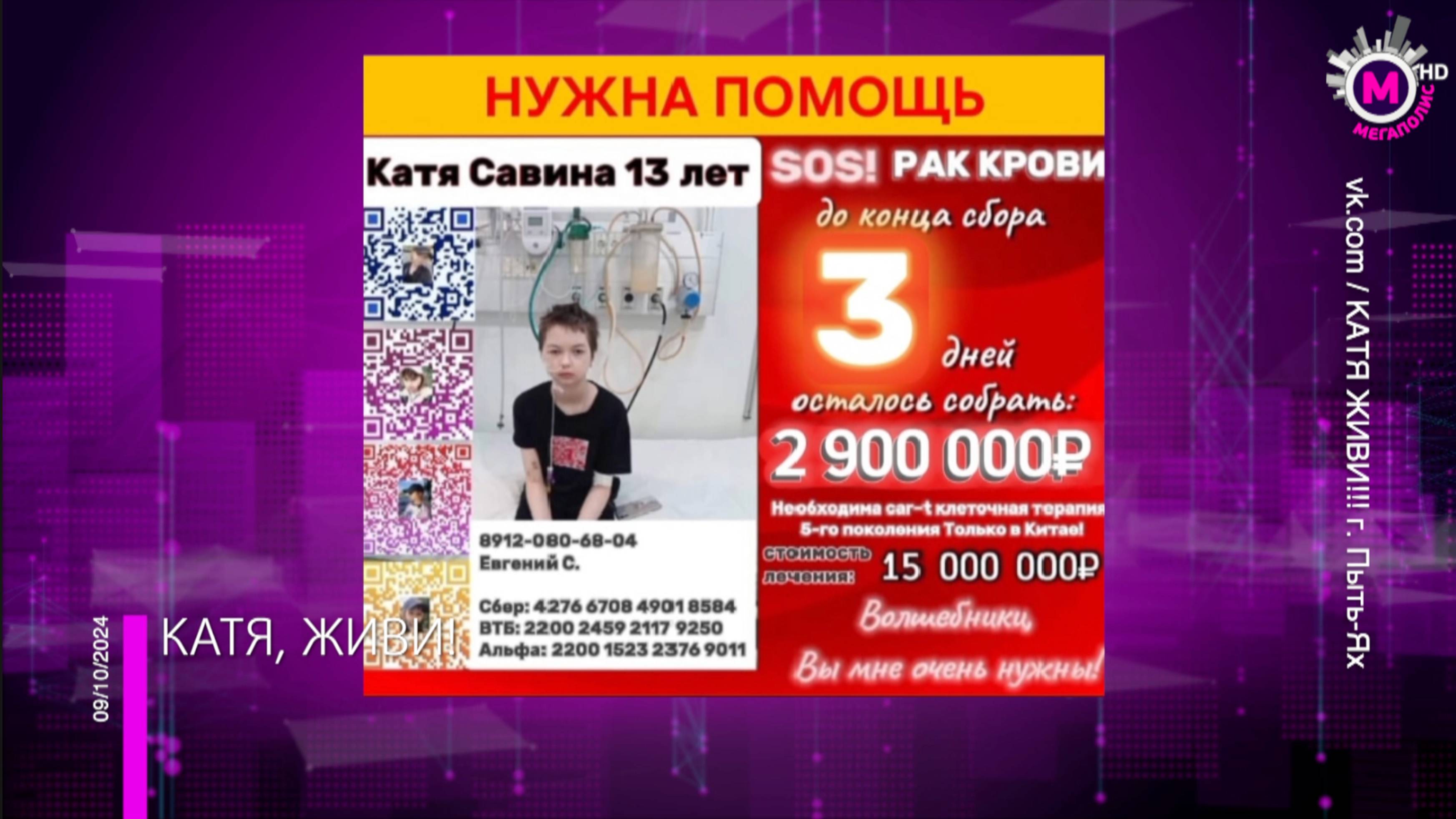 Вся Югра поднялась на поддержку Кати Савиной из Пыть-Яха. Девочка уже много лет борется с раком крови. У Кати появился последний шанс на выздоровление. А вот времени осталось катастрофически мало.